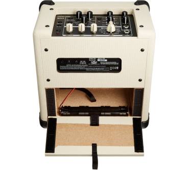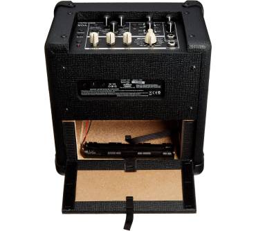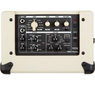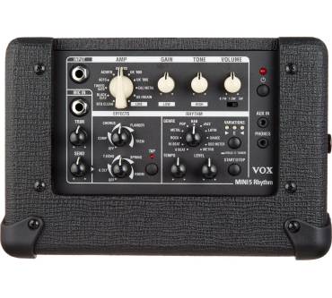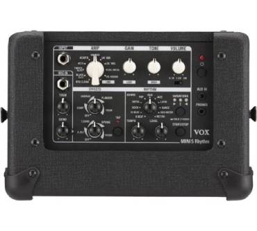 Stärken und SchwächenDer Mini Vox wirkt solide verarbeitet, besitzt ein schickes Äußeres, welches in verschiedenen Outfits auf dem Markt daher kommt. Der Blick auf die Bedienoberfläche lässt erahnen, womit man es hier zu tun hat: ein multidimensionales Effekt- und Rhythmusgenie. Zunächst ist es sehr erfreulich, dass selbst die 5 Watt Leistung, sich auf 1,5 und sogar 0,5 Watt runter schalten lässt. Damit kommen wir auf den gewohnten Wohnungspegel eines Fernsehgerätes, wenn es um den üblich verdächtigen Nachbarschaftsdiskurs geht. Über den 6,5“ Lautsprecher werden 11 Ampmodelle simuliert (das gängige Werkzeug von USA bis UK), die direkt ordentlich klingen und echten Spielspaß garantieren. Nachgewürzt wird über einen quasi 2-Band EQ (Gain-Low, Tone-High) – und dem Ausgangsvolumen natürlich. Die Zusatzeffekte sind das Besondere. Parallel können sozusagen 2 Effektsends kombiniert werden: Chorus, Flanger, Kompression oder Tremolo mit Delay, Spring Reverb, Echo oder Room. Außerdem gibt es einen Tap-Knopf, um das Timing per Finger einzutippen. Last but not least rundet ein interner Drumcomputer mit 99 Begleitrhythmen aus 10 Genres das Übungsangebot ab. Bemängelt wird gelegentlich die auftretenden Störgeräusche in Kombination mit Geräusche empfindlichen Kabeln bzw. dem mitgelieferten Netzstecker. Als rein batteriebetriebener Amp (6 mal AA) soll es aber keine Aussetzer geben.