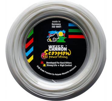 Die Saitenrolle von Weiss Canon ist in verschiedenen Längen und drei unterschiedlichen Stärken erhältlich, beispielsweise mit 200 Metern in der Stärke 1,22 Millimeter. Als Material hat der Hersteller Co-Polyester gewählt, das eine hervorragende Kontrolle und gute Spinningeigenschaften aufweisen soll. Die Saite besteht aus einem einzigen Strang und ist daher monofil. Im Vergleich zu Nylon- oder Multifilamentsaiten aus mehreren Fasern sind monofile Polyestersaiten oftmals etwas starrer, punkten dafür aber mit einer längeren Haltbarkeit. In Tests hat sich das bestätigt, allerdings zeigen sich geringe Schwächen in puncto Beschleunigung, Armschonung und Ballkontrolle. Kunden haben sich in Internetrezensionen mit der Power und weiteren Eigenschaften der Scorpion sehr zufrieden gezeigt.