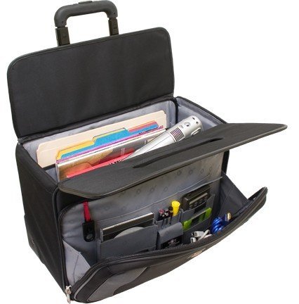Ebenfalls positiv: Ein zweites Fach bietet Platz für Dokumente, dazwischen soll sogar noch ausreichend Stauraum für weitere Ordner und Präsentationstechnik sein. Für den Schnellzugriff auf weitere Utensilien steht ein kleines Reißverschlussfach sowie ein Organizer-Vorfach mit diversen Steckfächern zur Verfügung. Und trotz seines enormen Raumangebots zeigt er sich äußerlich recht klein: Mit seinen Abmessungen von 48 x 37 x 24 Zentimeter entspricht er der IATA-Norm für bordzugelassenes Gepäck bis zu einer Bautiefe von 25 Zentimeter, sollte also bei den meisten Fluggesellschaften keine Probleme beim Check-In verursachen.