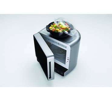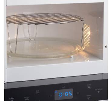 Die Mikrowellenleistung mit 700 Watt sollte bei dieser Gerätegröße völlig ausreichend sein, zumal der Garraum mit einem speziellen Reflektor bestückt ist. Seine Aufgabe ist eine sehr gleichmäßige Wellenverteilung und damit Erhitzung der Lebensmittel. Die angegebene Grill-Leistung von ebenfalls 700 Watt wirkt hingegen etwas schwächlich. Zusammen mit der mitgelieferten, speziell beschichteten „Crisp“-Platte und dem kombinierten Einsatz von Grill und Mikrowellen sollen aber dennoch knusprige Pizzen und gut gebräunte Speisen gelingen.