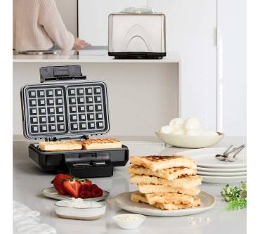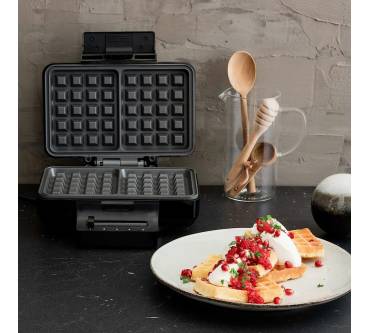 Mit dem Waffeleisen lassen sich rechteckige und dicke Belgische Waffeln herstellen. Sie wählen Konsistenz und Bräunung von weich bis knusprig, sowie hell bis dunkel individuell nach Ihrem Geschmack. Das leicht verstellbare Thermostat bietet fünf verschiedene Einstellung. Dank einem starken 1.000 Watt Heizelement ist das Gerät schnell aufgeheizt und einsatzbereit. Die soliden Backblatten sind mit einer doppelten Antihaft-Beschichtung versehen. Diese verhindert ein Anbrennen und Ankleben des Waffelteigs, die fertigen Waffeln lassen sich zudem einfach entnehmen. Die Backampel und das LED-Signal geben Auskunft über die optimale Backzeit. Waffel-Ergebnisse gelingen Rezensenten zufolge gleichmäßig, authentisch und gut. Die Antihaft-Platten sind herausnehmbar und lassen sich leicht reinigen. Bei Nichtgebrauch können Sie das Waffeleisen aufrechtstehend und platzsparend verstauen.