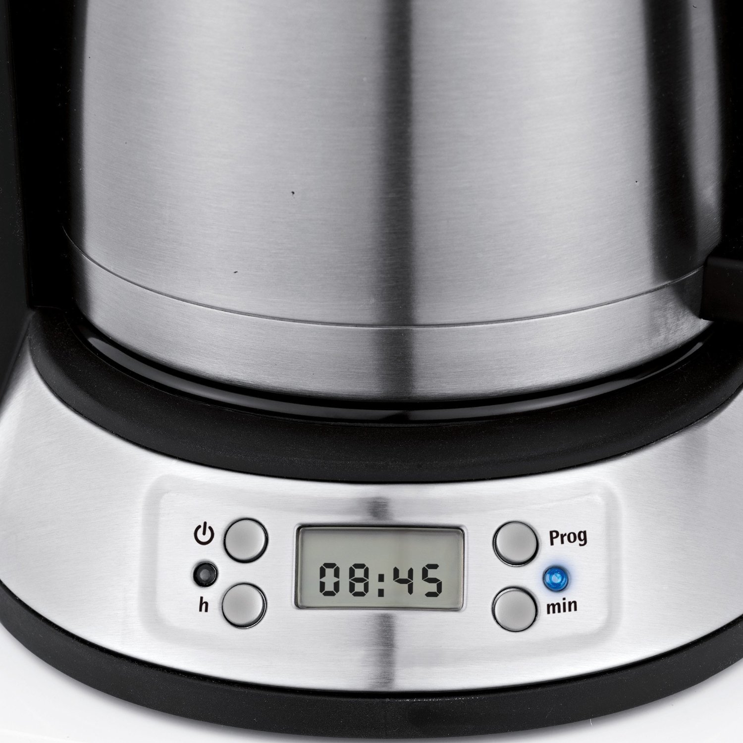 Die WMF zählt zwar nicht zum kleinen Kreis der Modelle mit einem integrierten Mahlwerk, ist demnach also in technischer Hinsicht kein Mitglied der „Königsklasse“ unter den Filter-Kaffeemaschinen. Trotzdem bietet sie mehr an Ausstattung als der Durchschnitt. An erster Stelle verdient es natürlich der Timer erwähnt zu werden. Bis zu 24 Stunden vor dem Brühvorgang kann ein Zeitpunkt festgelegt werden, an dem die Maschine mit der Herstellung von Kaffee beginnt. Allerdings ist es weniger ratsam, diese Zeitspanne voll auszunutzen, da das Kaffeepulver ansonsten im Filter deutlich an Geschmack verlieren könnte. Die Einstellung kann auf einem kleinen Display, dem die Maschine ihren Namenszusatz „Digital“ verdankt, abgelesen werden. Des Weiteren ist auch die Abschaltautomatik keine Funktion, über die jede Kaffeemaschine verfügt, und auch die Thermokanne ist ein Ausstattungsmerkmal, das nicht allzu häufig anzutreffen ist. In die Thermokanne passen übrigens acht Tassen Kaffee, also zwei weniger als in die Version mit einer Glaskanne (55 EUR, Amazon). Eine Überlaufsicherung garantiert dabei, dass nichts schief gehen kann. Die Kanne selbst wird aus Edelstahl gefertigt und – ganz wichtig, weil nicht selbstverständlich – tropft nicht beim Eingießen in die Tasse – allerdings soll das Ausgießen aufgrund der relativ kleinen Öffnung nur sehr langsam vor sich gehen. Außerdem hält sie den Kaffee etwa zwei Stunden auf Temperatur.