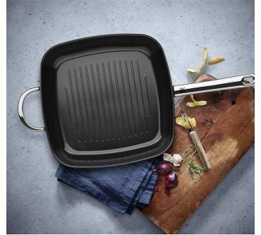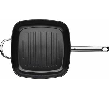 Die Durado Grillpfanne von WMF ist mit ihrer Größe von 28 x 28 Zentimetern für ein bis zwei mittelgroße Fleischstücke oder auch Gemüse für zwei bis drei Personen geeignet. Sie ist mit Cromargan-Edelstahl beschichtet, das aufgrund des hohen Chromanteils als besonders robust gilt und zugleich geschmacksneutral und spülmaschinenfest ist. Das erleichtert nicht zuletzt die Pflege der Pfanne. In Tests wird die Handhabung gelobt, weder Fleisch noch etwa Grillkäse bleiben haften – wenn auch die Grillrillen auf Steaks und Co. nicht sonderlich ausgeprägt sind. Leider fehlt eine Ausgussöffnung für den Fleischsaft. Das ist jedoch nur ein kleiner Minuspunkt, sodass der Kauf der WMF Durado Grillpfanne empfohlen werden kann – zumal Sie aktuell gerade mal knapp 58 Euro dafür zahlen.