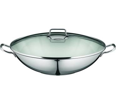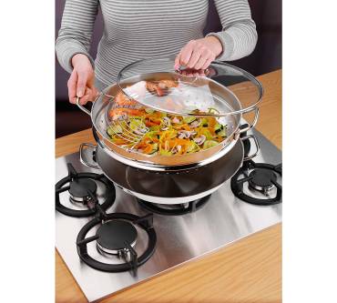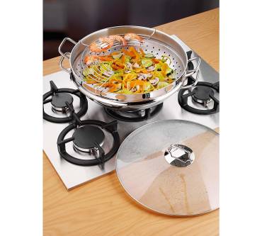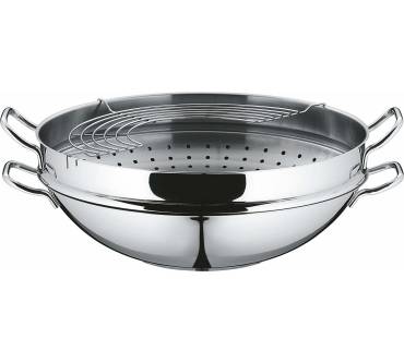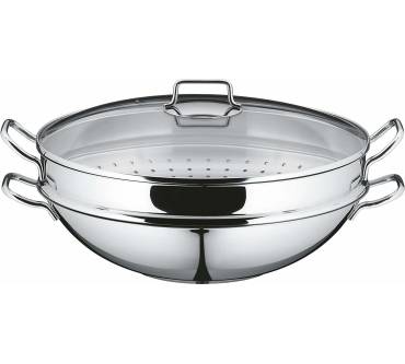 Beim WMF Macao Party Wok-Set, 4-tlg zeigt sich schnell, wer mit der Handhabe von Edelstahl-Kochgeschirr bereits vertraut ist. Um hohe Hitzbeständigkeit zu erreichen, wurde auf eine Antihaftbeschichtung – und damit auf das Versprechen "Nichts backt an" – verzichtet. Fisch, Fleisch und Eispeisen haften regelmäßig am schnell aufgeheizten TransTerm-Allherdboden an, lösen sich aber auch nach kurzer Zeit wieder. Daher gilt tatsächlich: Wer vorher rührt, verliert. Gerade langjährige Nutzer*innen von Kochgeschirr mit Beschichtung dürften hier ihre Probleme haben. Wer sich dagegen auf die Eigenschaften des Cromargan-Edelstahls einlässt, erhält einen zuverlässigen Begleiter zur Zubereitung traditioneller asiatischer Gerichte. Scharfes Anbraten, Dämpfen, Dünsten, Schmoren und Frittieren auch großer Mengen sind mit Macao kein Problem. Einzig die Reinigung im Nachhinein kostet Zeit.