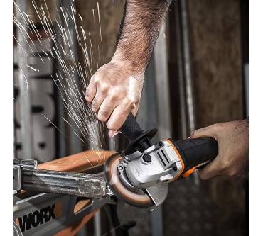 Wenn Sie im Rahmen Ihrer Hobby-Projekte gelegentlich einen kleinen Winkelschleifer benötigen, können Sie den WX800 genauer unter die Lupe nehmen. Der Worx gehört zu den kompakten Vertretern seiner Produktkategorie und kann auch schlecht zugängliche Stellen erreichen. Mit einer Scheibengröße von maximal 115 Millimeter bringt er es auf eine limitierte Schnitttiefe von gerade einmal 18 Millimeter. Das Netto-Gewicht von 1,5 Kilogramm entspricht dem Leistungsvermögen des Schleifers. Der einfache Zusatzhandgriff bietet nur zwei Positionen, die Montage am Getriebedach ist nicht möglich. Ergonomische Aspekte sind in Form einer Softgrip-Einlage im Griffbereich und der gut gewählten Position des Einschalters verwirklicht.