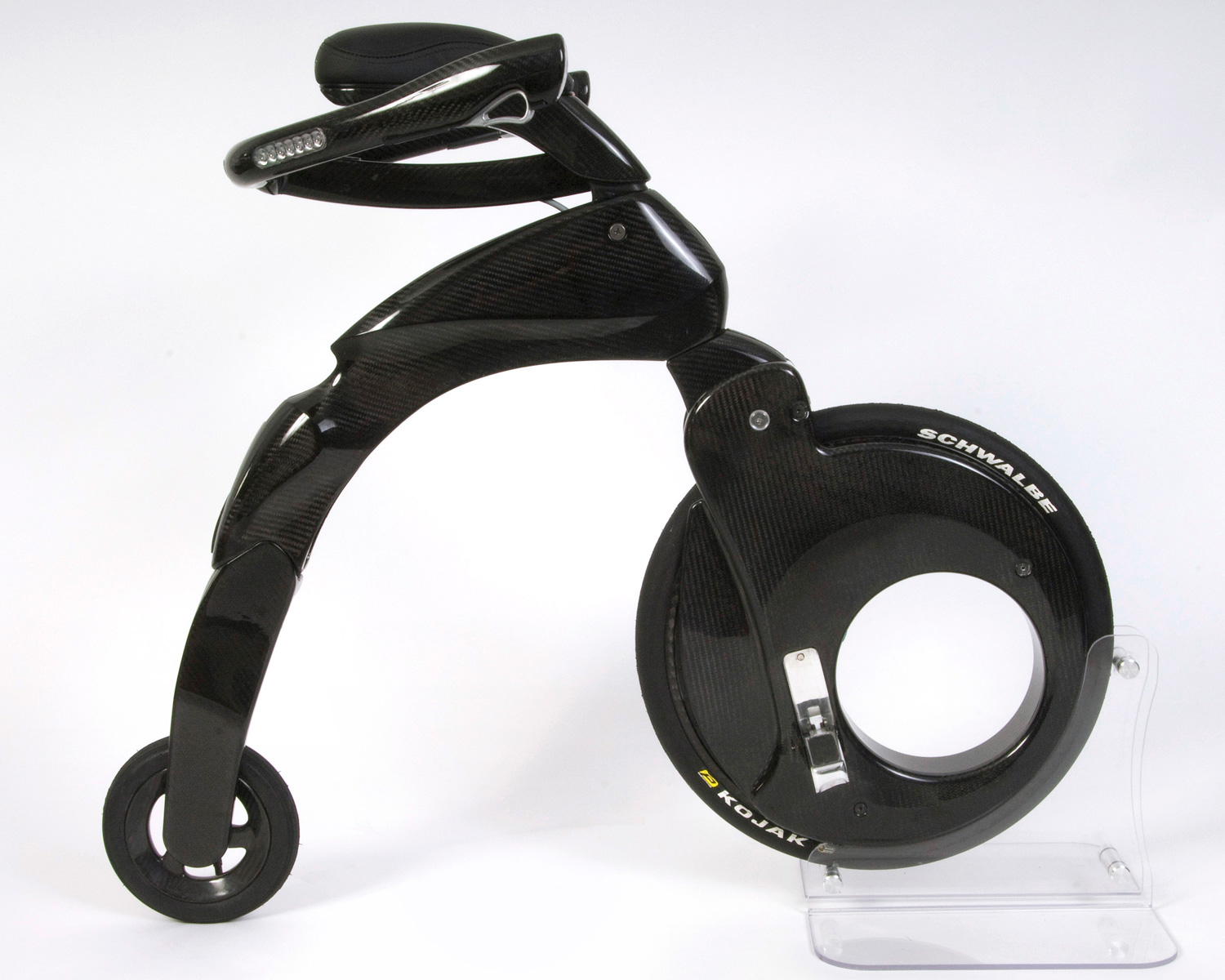 Das Rad ist mit integrierten Lichtern und Blinkern zur Richtungsanzeige besetzt. In weniger als 15 Sekunden soll das Mini-Bike faltbar sein. Eine Tragtasche von wirklich überraschend handlicher Größe wird mitgeliefert. Zehn Kilo wiegt das Bike jedoch trotzdem noch.