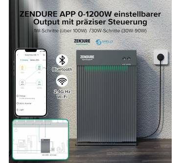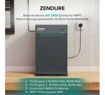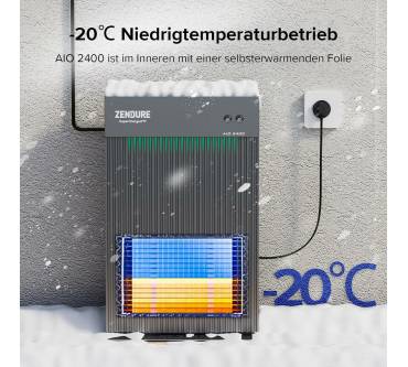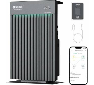 Der Stromspeicher von Zendure ist als Pufferelement zwischen einer Photovoltaikanlage und dem häuslichen Niederspannungsnetz konzipiert. Bei starker Sonneneinstrahlung wird die nicht benötigte elektrische Energie zwischengespeichert und kann dann in den Abendstunden in das Stromnetz eingespeist werden. Die Speicherkapazität beträgt 2,4 Kilowattstunden. Die Ausgangsleistung begrenzen Sie nach Ihren Erfordernissen im Bereich bis 1,2 Kilowatt. Auf der Eingangsseite stehen zwei Anschlüsse für separate Module oder Modulgruppen zur Verfügung, die maximale Eingangsleistung beträgt 1,56 Kilowatt. Der Stromspeicher kann als Standgerät betrieben werden, die Wandmontage ist nicht notwendig. Der Anschluss gestaltet sich unkompliziert, Sie müssen den Schukostecker des AIO 2400 lediglich in eine beliebige Steckdose stecken. Die Anlage ist mit einem Thermoelement ausgestattet, sodass sie auch bei Temperaturen bis -20 Grad Celsius einsatzfähig ist. Überwachung und Steuerung erledigen Sie bequem über Ihr Smartphone.