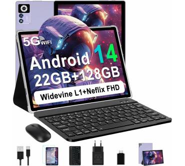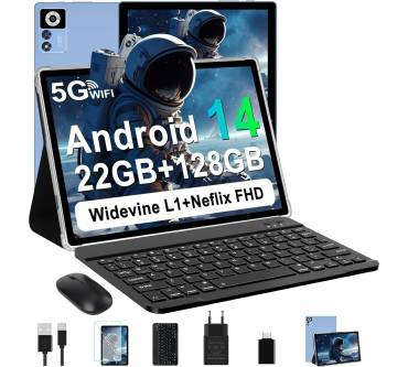Das Ziovo Z168 ist ein 10,1-Zoll-Tablet, das mit Android 14 betrieben wird und von einem UNISOC T606 Octa-Core-Prozessor mit bis zu 2,0 GHz angetrieben wird. Es verfügt über 22 GB RAM und 128 GB internen Speicher, erweiterbar auf bis zu 1 TB. Das Gerät unterstützt 5G-Konnektivität, Wi-Fi 5 (802.11ac), Bluetooth 5.0 und GPS. Der 8000-mAh-Akku ermöglicht eine längere Nutzung ohne häufiges Aufladen. Das 10,1-Zoll-Display bietet eine Auflösung von 1280 x 800 Pixeln. Zusätzlich sind eine 8-MP-Hauptkamera und eine 5-MP-Frontkamera integriert. Das Tablet misst 24,3 x 16,1 x 0,9 cm und wiegt 1,34 kg. Im Lieferumfang sind eine Tastatur, eine Maus und eine Schutzhülle enthalten.