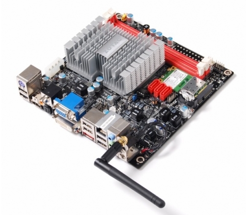 Jetzt ist endlich eine flüssige Darstellung im 1080p-Modus auf einem kleinen Atom-PC möglich. Bilder können über einen VGA-, DVI und HDMI-Ausgang exportiert werden und die Kompatibiltät zu HDCP garantiert die Ausgabe eines geschützten Videoinhaltes. Selbst Dolby Digital True HD kann über den 7.1-Audio-Port realisiert werden. Der Arbeitsspeicher darf auf den beiden Slots 4 GByte betragen und eine Fülle von Schnittstellen machen das Zotac IONITX A zu einem starken Kleinen: 10 USB-Port, eine eSATA-Schnittstelle und drei interne SATA II-Konnektoren, die drei Platten im RAID 0.1,0+1 verwalten können. Eine kleine WLAN-Antenne sorgt für kabelfreie Netzwerkanbindung und unabhängige Platzierung.