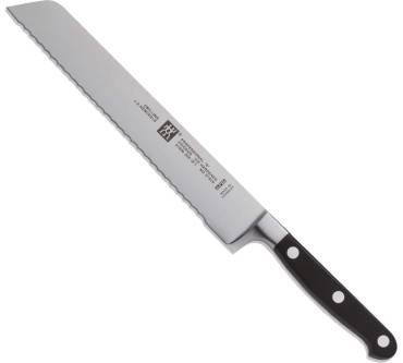 Mit diesem Brotmesser aus der Professional-Serie von Zwilling schneiden Sie auch dickere Brotkrusten flüssig und glatt. Die eisengehärtete Klinge weist den typischen Wellenschliff auf und ist mit 20 cm lang genug für große Laibe. Sie ist aus einem Stück geschmiedet und daher besonders stabil und haltbar. Der verwendete Stahl wird mit einer speziellen Technik hergestellt (Zwillinger Sonderschmelze) und ist flexibel und rostfrei. Da der Übergang zum Griff fugenlos erfolgt, kann sich dort kein Schmutz festsetzen und Sie arbeiten hygienischer. Laut Rezensenten liegt das Messer gut in der Hand und lässt sich sicher führen. Vereinzelt wird aber von Qualitätsmängeln wie abfallenden Griffschalen berichtet. Aus der gleichen Serie können Sie noch weitere Varianten bzw. einen ganzen Messerblock erwerben.