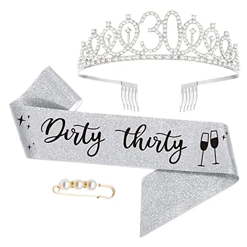 "Dirty Thirty" 30. geburtstagskrone, Geburtstags-Krone Schärpe Set, 30 Geburtstag Deko für Frauen alles Gute zum 30. Geburtstagsgeschenk, Partyzubehör, Dekorationen (Silber)