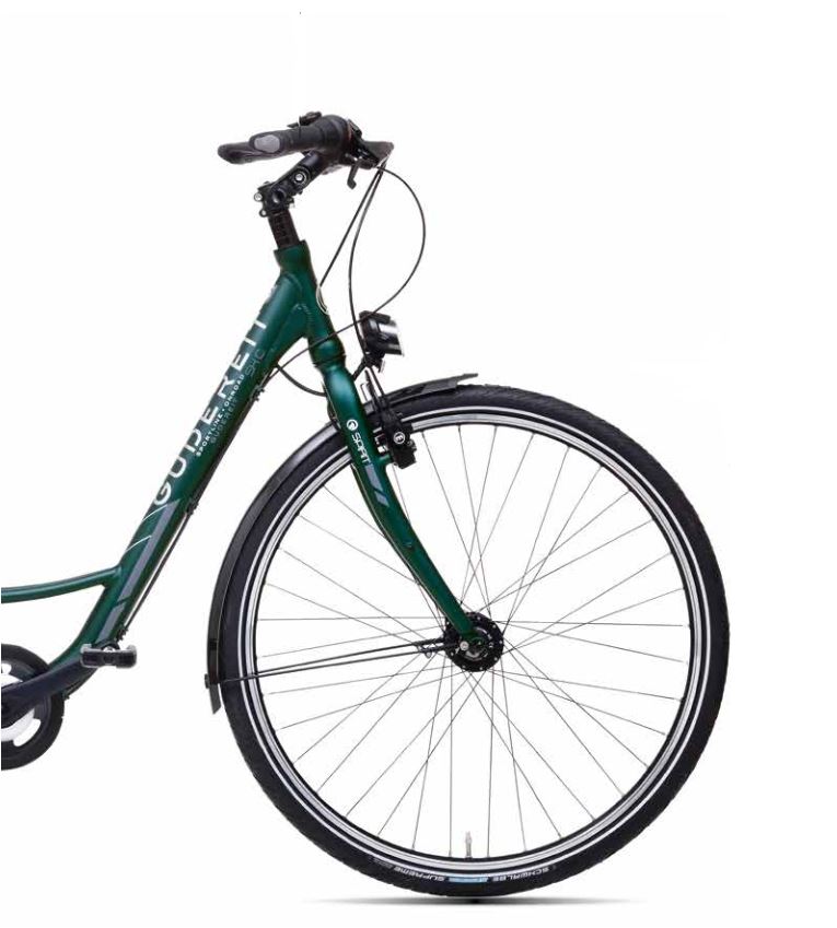 Was Gudereit in die Waagschale wirft, ist ein erhöhter Aufwand bei der Herstellung seiner Räder in sechs verschiedenen Rahmengrößen und Formen, wie sie noch selten bei Wettbewerbern zu finden sind – zumindest in den unteren Preissphären. Absatzkrisen und Euroschwächen scheinen bei Gudereit nicht zu Sparzwängen geführt zu haben. Unter den Rahmenformen für Herren, Damen, Trapez, New Wave und Mixte bis zum Einrohr hat man jeweils die Auswahl aus acht Rahmenhöhen. Dasselbe positive Bild bei der Beleuchtung: Überwiegend findet sich Lichtautomatik, stoisch setzt man auf die besonders lichtstarken LED-Scheinwerfer zur besseren Sichtbarkeit im Dunkeln und vor allem leichtlaufende Sport-Modelle (AXA Pico oder AXA LUXX70). Seit 2005 werden insbesondere Kinderräder (Streetline) mit Senso-Technik (beim Nabendynamo) ausgestattet, die dank einer Fotozelle bei Dunkelheit selbsttätig einschaltet.Trekkingline: Helle Seitenausleuchtung