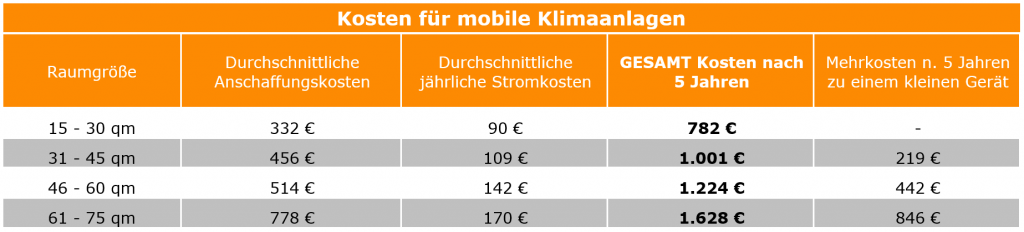 Wer noch größere Räume ab 46 Quadratmeter kühlen möchte, muss deutlich tiefer in die Tasche greifen und bezahlt rund 50 Euro mehr für Strom. Nach 5 Jahren sind die Gesamtkosten bereits rund 450 Euro höher. Ab 61 Quadratmeter sind es pro Jahr 80 Euro mehr für Strom. Die Gesamtkosten sind nach fünf Jahren sogar fast 850 Euro höher, als wenn nur ein kleinerer Raum gekühlt würde.