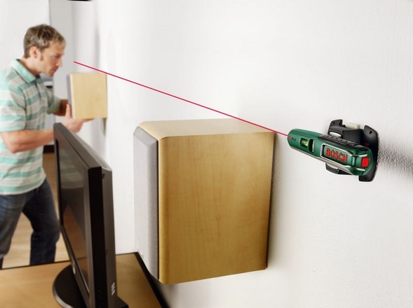 Besonders in Altbauten steht man häufig vor dem Problem, dass man sich aufgrund der schiefen Wände nirgends orientieren kann, um ein Bild, ein Regal oder sonstiges gerade an der Wand anzubringen. Abhilfe schafft die Laser-Wasserwaage PLL 5 von Bosch, die per Laserstrahl eine perfekte horizontale Linie an die Wand wirft. Dafür kann das Gerät dank der Wandhalterung an jeder Oberfläche arretiert werden. Ohne Spuren zu hinterlassen funktioniert das allerdings nur auf glatten Wänden, hier kann ein Klebestreifen benutzt werden, alle anderen Wände werden mit Pins gespickt oder müssen mit einer Schraube versehen werden. Oder ein Helfer mit einer chirurgisch ruhigen Hand hält das Gerät fest.