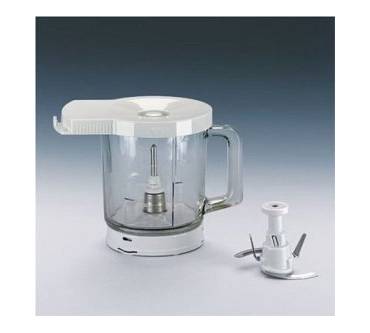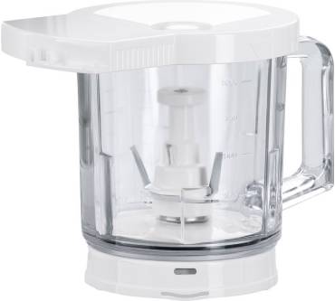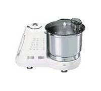 „Gut für Kräuter. Noch kompakte Küchenmaschine mit viel Grundausstattung: Edelstahl- und Universalschüssel, Mixtulpe, Raspelscheiben, Universalmesser und mehr. Aber: Kein Sonderzubehör im Programm. Tabelle mit Kurzanleitung am Gerät. Knetet auch große Mengen. Sehr gut zum Mixen und Kräuterhacken. Bringt aber wenig Luft beim Schlagen.“