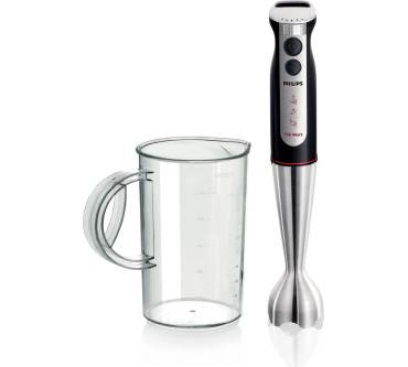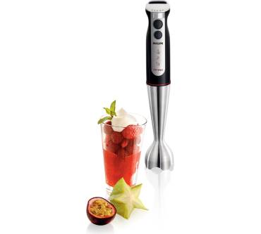 „Das Messer des Stabmixers schafft mit seiner Doppelklinge selbst härteste Zutaten. Mit viel gebürstetem Edelstahl passt das Gerät in jede Designerküche. Der Softtouch-Griff ist rutschsicher. ...“