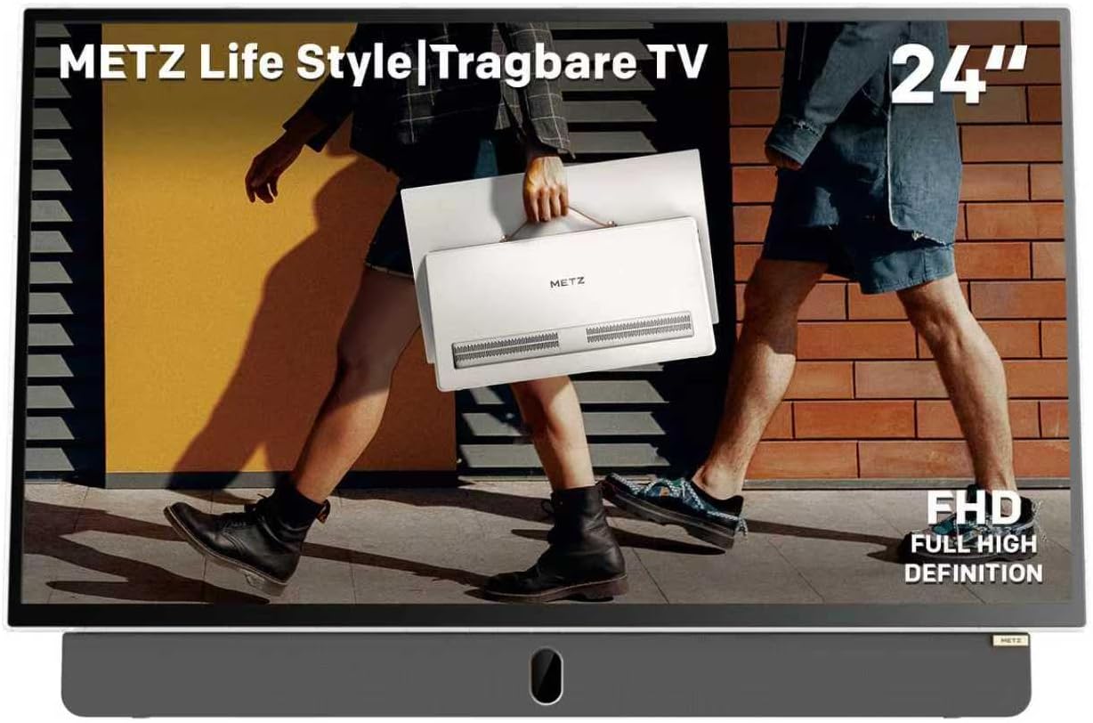 Metz blue 24MPE7000: Tragbarer 24-Zoll-Smart-TV mit eingebautem Akku, mattem Display und Google TV – ideal für Camping, Wohnmobil und unterwegs. (Bildquelle: amazon.de)