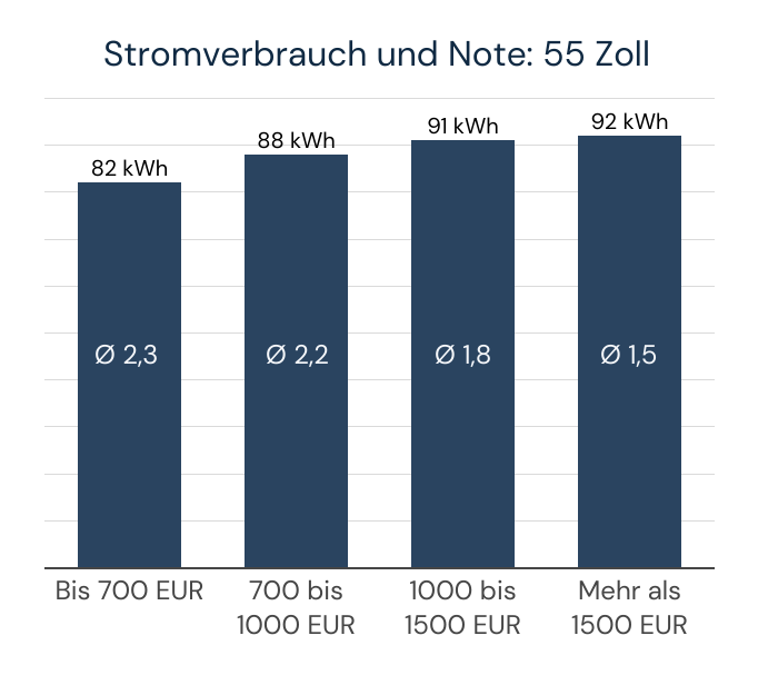 Wie sich zeigt, landen die 55-Zöller der niedrigsten Preisklasse bei durchschnittlich 82 kWh auf 1000 Stunden, was rund 32 Euro entspricht. Die teuren 55-Zöller kommen hier schon auf 92 kWh bzw. 36 Euro. Dafür verbessert sich die Note mit jeder Preisklasse. Sehr gut lässt sich das an Beispielen veranschaulichen. Sonys XR-55A90J kassiert eine starke Testberichte.de-Note (1,5), kostet aber mehr als 1300 Euro und zieht mit 113 kWh (G) ordentlich Leistung. Dass es auch möglich ist, in eine bessere Effizienzklasse zu rutschen, ohne zu viele Abstriche beim Bild zu machen, beweist der TCL 55C635 – gut, günstig und mit Klasse F relativ energiesparend.