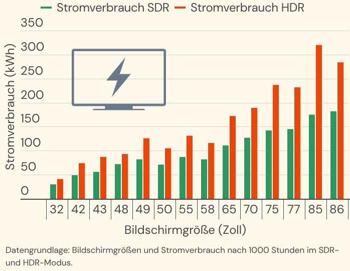 Beide Angaben, also kWh im Standard- und im HDR-Betrieb, werden auf 1000 Stunden hochgerechnet. Die jährliche Nutzungsdauer von 1000 Stunden entspricht einer täglichen Bildschirmzeit von gut drei Stunden – wobei die Werte im deutschen Durchschnitt wohl noch höher liegen. Nicht zuletzt wirkt sich auch die Bildschirmgröße auf den Stromverbrauch aus. Wie stark, können Sie folgender Grafik entnehmen.
