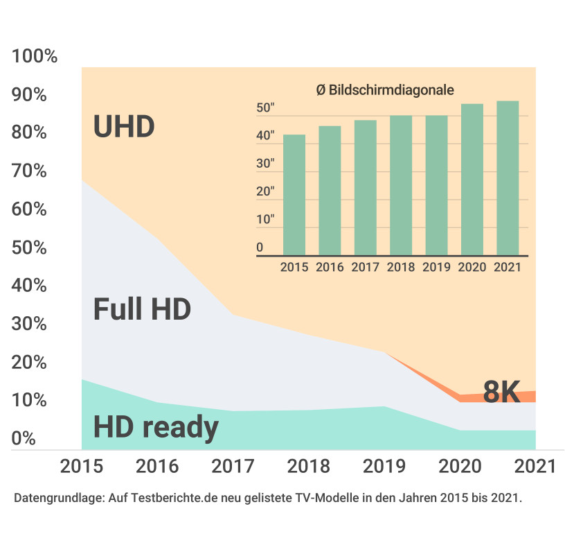 Schnell beantwortet: weder ja noch nein. Zurzeit halten sich Hersteller mit 8K-Geräten zurück. In unserer Grafik können Sie die Anlagen der unterschiedlichen Bildschirmauflösungen bei Testberichte.de und den Zuwachs bei Bildschirmdiagonalen seit 2015 einsehen. Auffällig ist die geringere Markteinführung von 8K-TVs im Vergleich zu anderen Auflösungen - die konsequente Zunahme an 8K-Modellen selbst zeigt jedoch das bestehende Interesse an dem Auflösungsformat. Der Knackpunkt: Es fehlen schlicht noch gute 8K-Inhalte - etwa durch Streamingdienste -, weswegen die Anschaffung eines entsprechenden Fernsehers für viele Kund:innen uninteressant bleibt.